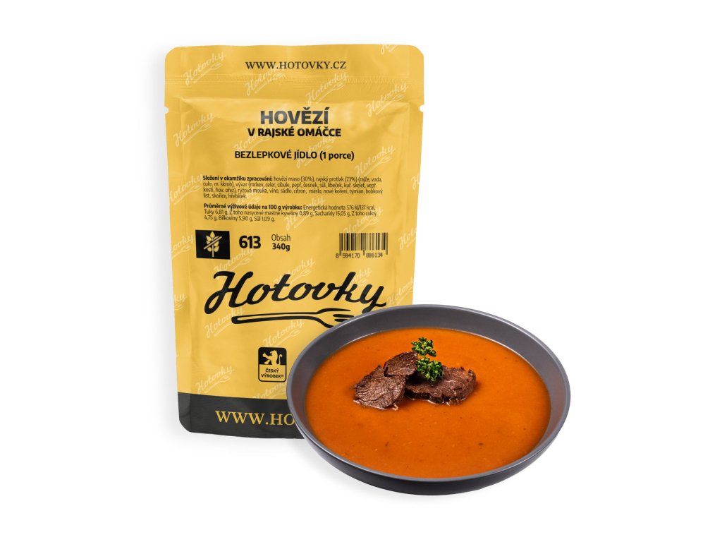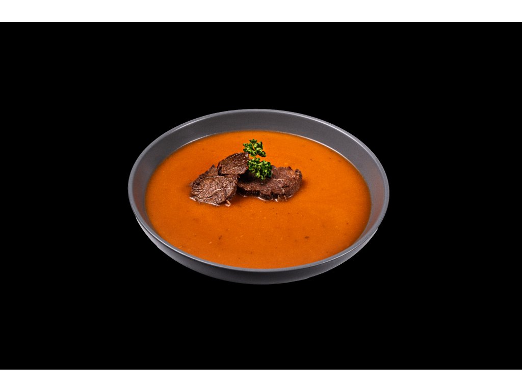 - Složení: hovězí maso (30%), rajský protlak (23%) (rajče, voda, cukr, m. škrob), vývar (mrkev, celer, cibule, pepř, česnek, sůl, libeček, kuř. skelet, vepř. kosti, hov. ořez), rýžová mouka, víno, sádlo, citron, máslo, nové koření, tymián, bobkový list, skořice, hřebíček.