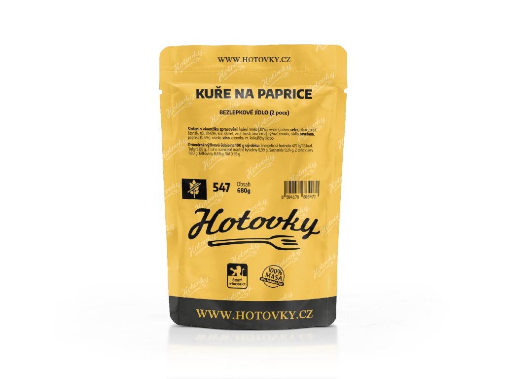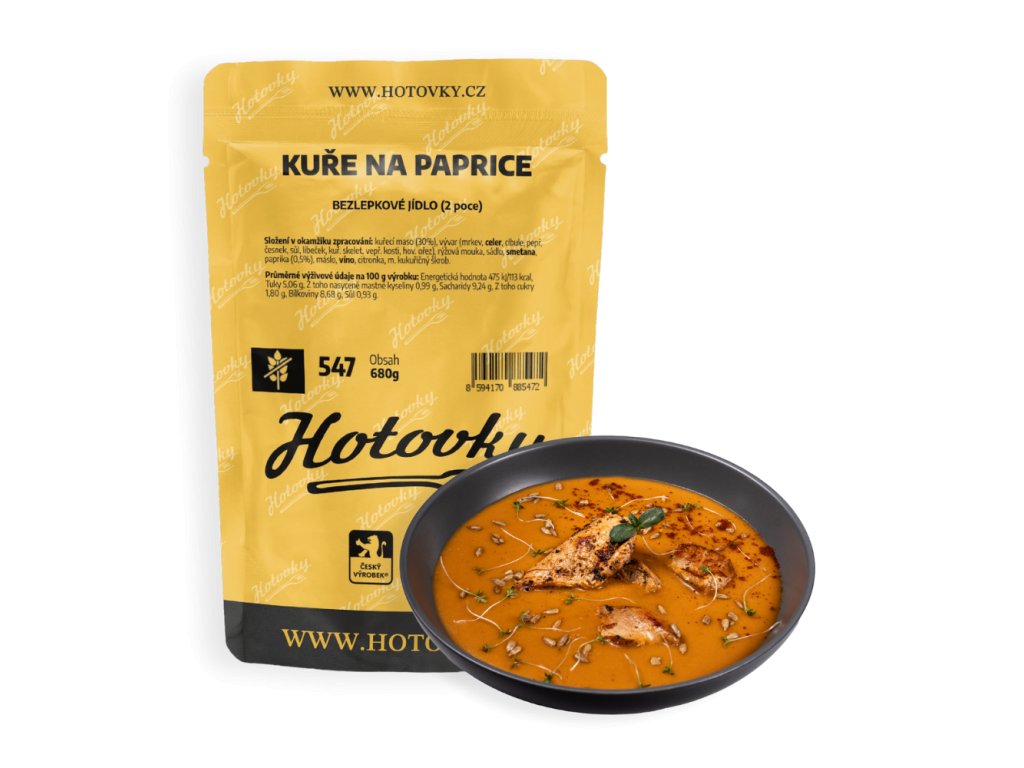 - Složení: kuřecí maso (30%), vývar (mrkev, celer, cibule, pepř, česnek, sůl, libeček, kuř. skelet, vepř. kosti, hov. ořez), rýžová mouka, sádlo, smetana, paprika (0,5%), máslo, víno, citronka, m. kukuřičný škrob.