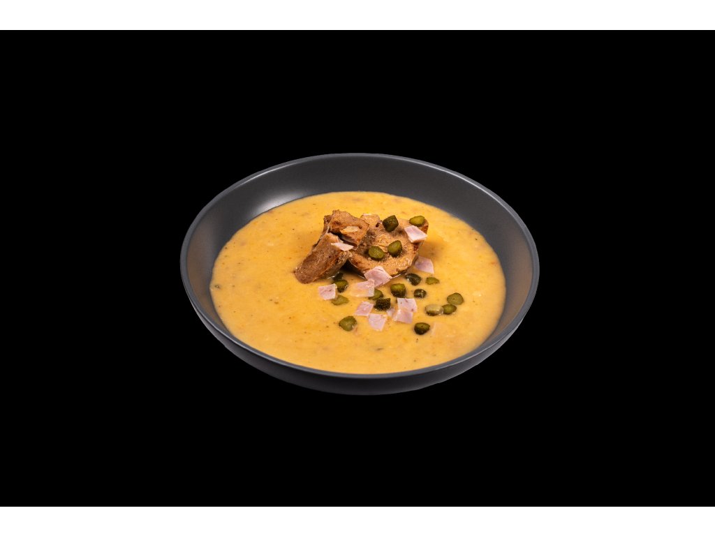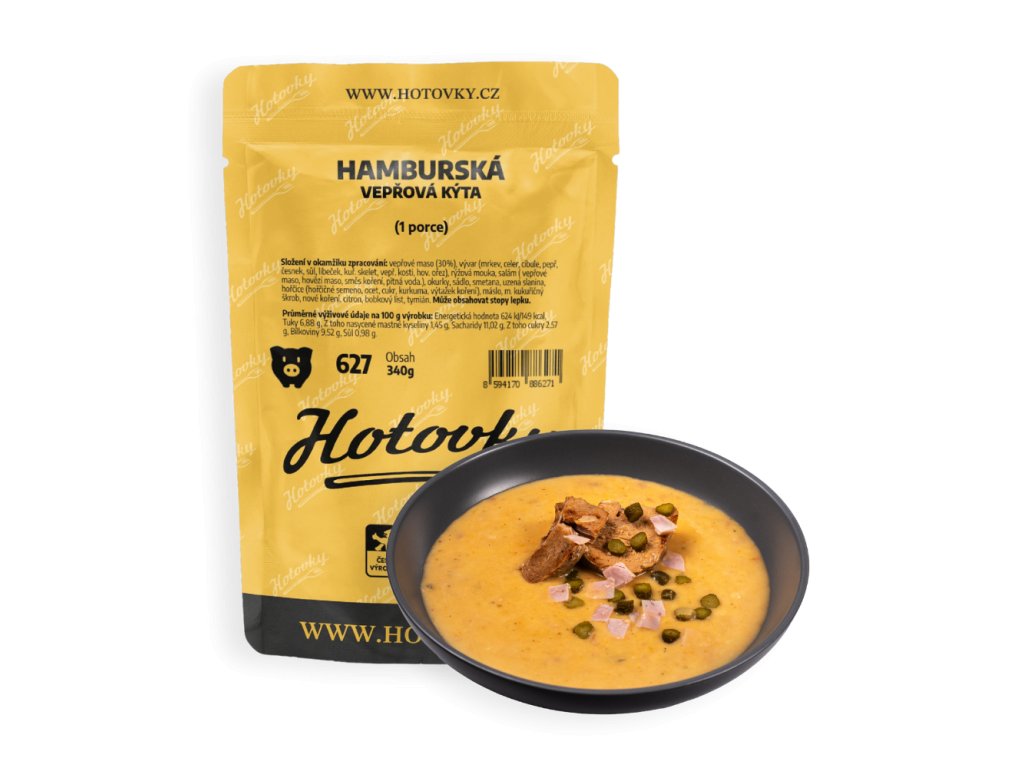 - Složení: vepřové maso (30%), vývar (mrkev, celer, cibule, pepř, česnek, sůl, libeček, kuřecí skelet, vepřové kosti, hovězí ořez), rýžová mouka, salám (vepřové a hovězí maso, směs koření, pitná voda), okurky, sádlo, smetana, uzená slanina, hořčice (hořčičné semeno, ocet, cukr, kurkuma, výtažek koření), máslo, kukuřičný škrob, nové koření, citron, bobkový list, tymián.
