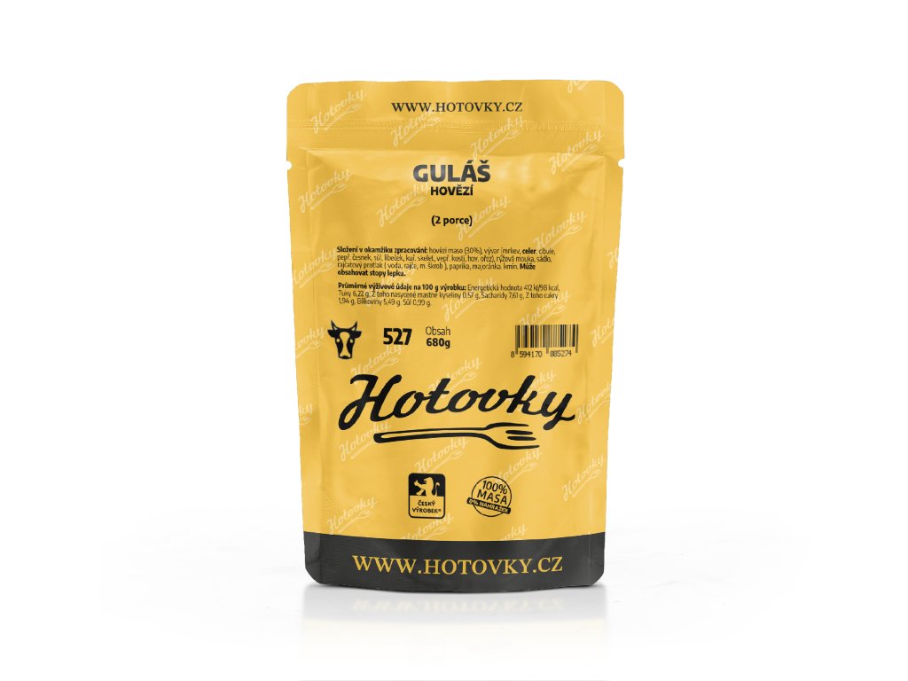 - Složení: hovězí maso (30%), vývar (mrkev, celer, cibule, pepř, česnek, sůl, libeček, kuřecí skelet, vepřové kosti, hovězí ořez), rýžová mouka, sádlo, rajčatový protlak (voda, rajče, m. škrob), paprika, majoránka, kmín.