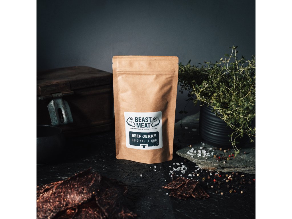Objevte sílu kvalitního českého hovězího masa s naším Hovězím jerky, které je jemně okořeněné barevným pepřem a sušeným česnekem. Naplní vás energií a chutí, ideální na cesty nebo jako svačinka.