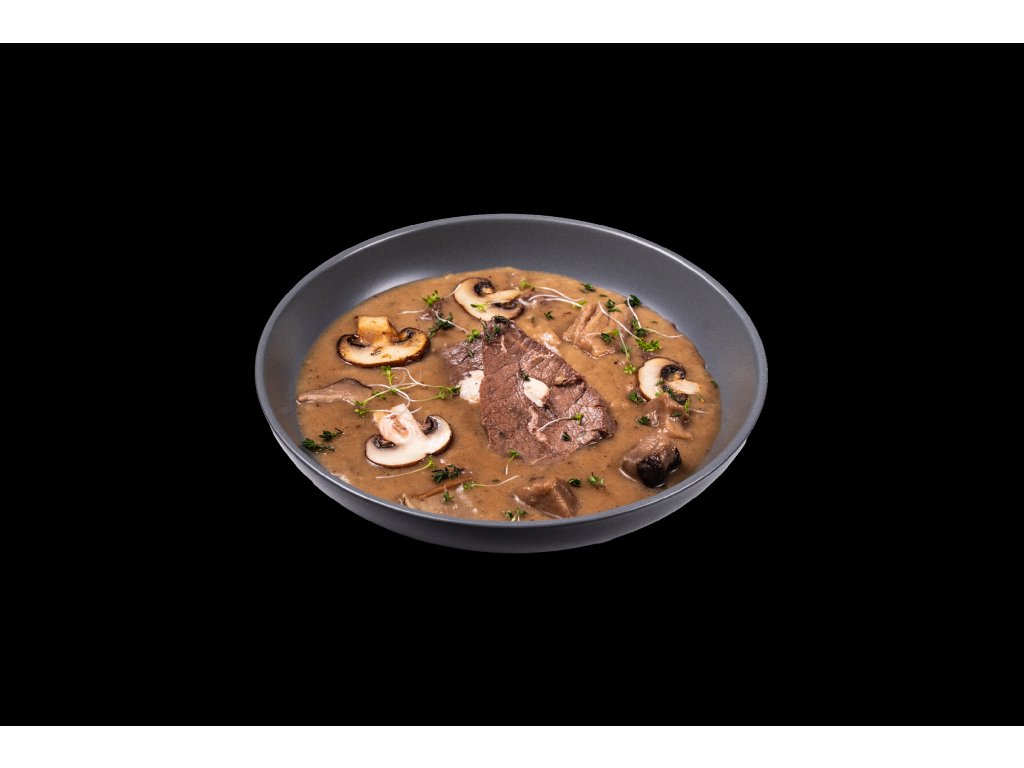 Dopřejte si vynikající chuť hovězího masa s lahodnou omáčkou s hříbky. Tento pokrm je ideální pro milovníky výživných a chutných jídel!