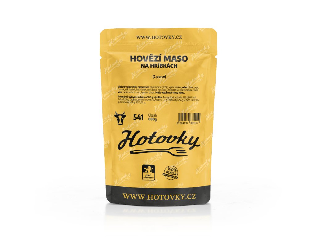 - Složení: hovězí maso (30%), vývar (mrkev, celer, cibule, pepř, česnek, sůl, libeček, kuř. skelet, vepř. kosti, hov. ořez), hřiby (12%), rýžová mouka, sádlo, víno, směs koření, kmín, tymián, citron.