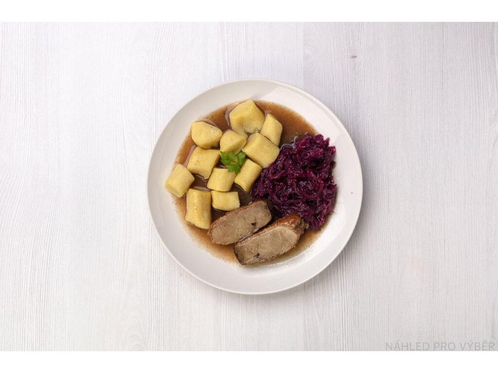 Kachní prsa s červeným zelím, bramborové špalíčky