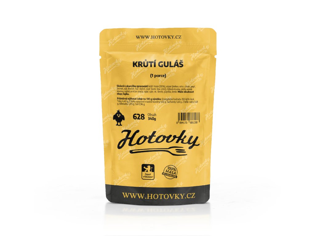 - Složení: krůtí maso (30%), vývar (mrkev, celer, cibule, pepř, česnek, sůl, libeček, kuřecí skelet, vepřové kosti, hovězí ořez), rýžová mouka, sádlo, uzená slanina, rajský protlak (voda, rajče, cukr, modifikovaný škrob), paprika, kmín.