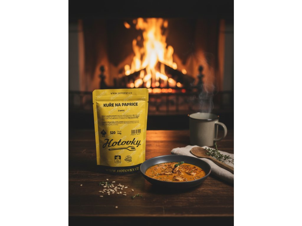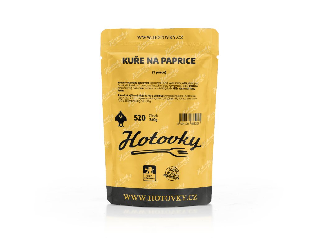 - Složení: kuřecí maso (30%), vývar (mrkev, celer, cibule, pepř, česnek, sůl, libeček, kuř. skelet, vepř. kosti, hov. ořez), rýžová mouka, sádlo, smetana, paprika (0,5%), máslo, víno, citronka, m. kukuřičný škrob.