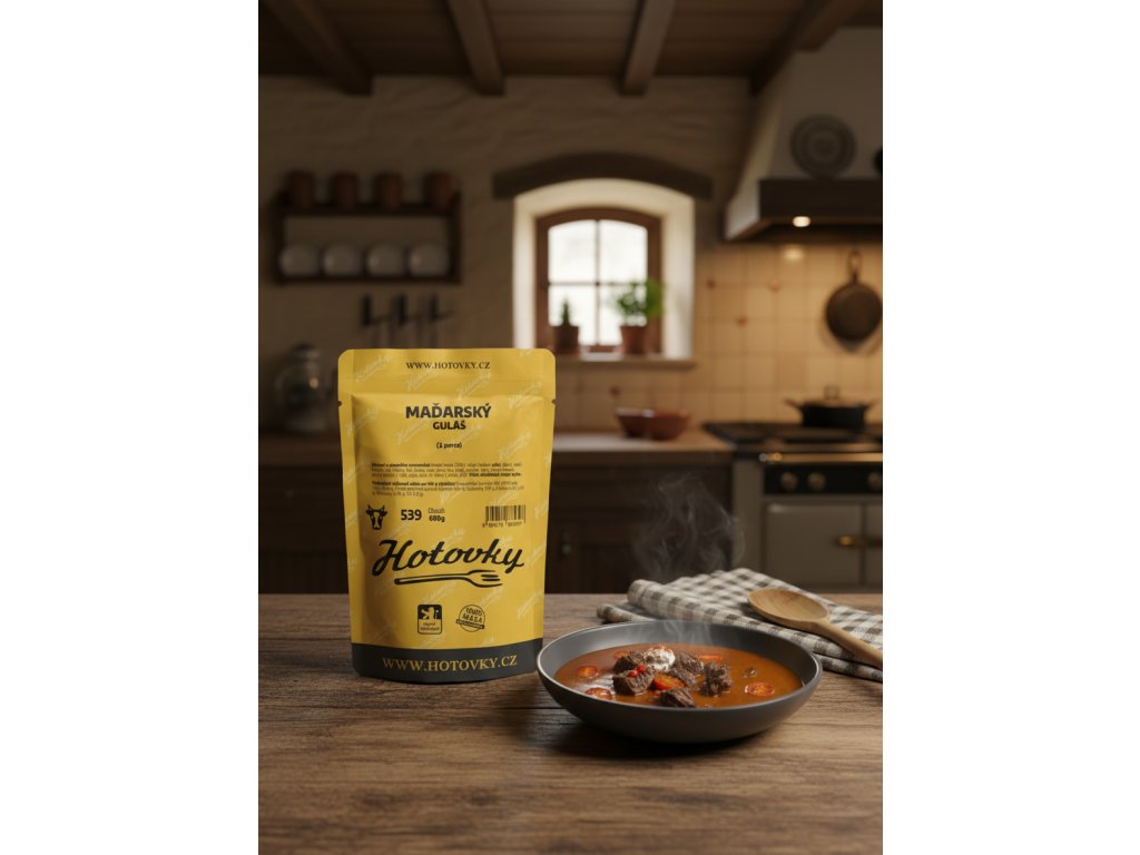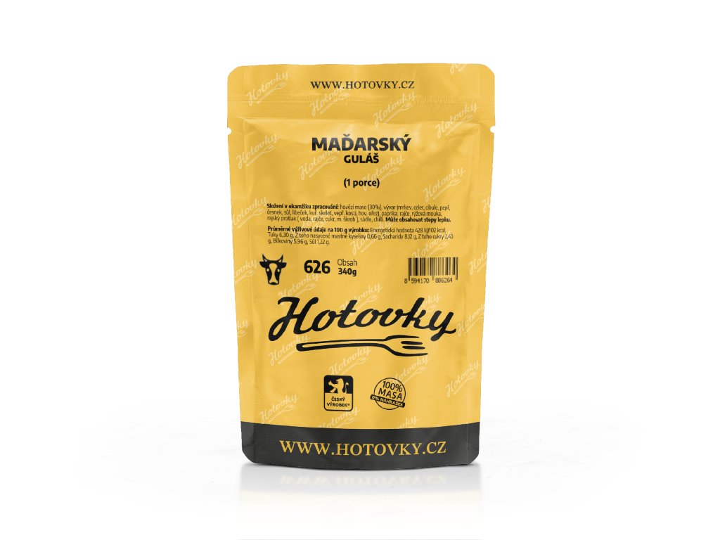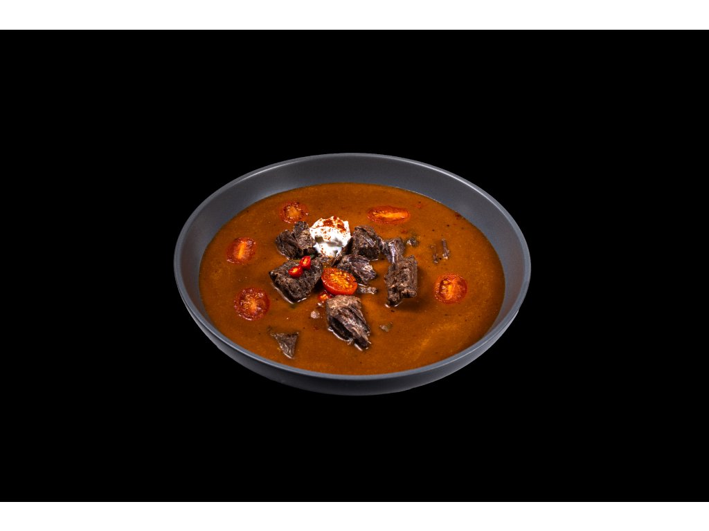 - Složení: hovězí maso (30%), vývar (mrkev, celer, cibule, pepř, česnek, sůl, libeček, kuřecí skelet, vepřové kosti, hovězí ořez), paprika, rajče, rýžová mouka, rajský protlak (voda, rajče, cukr, modifikovaný škrob), sádlo, chilli.