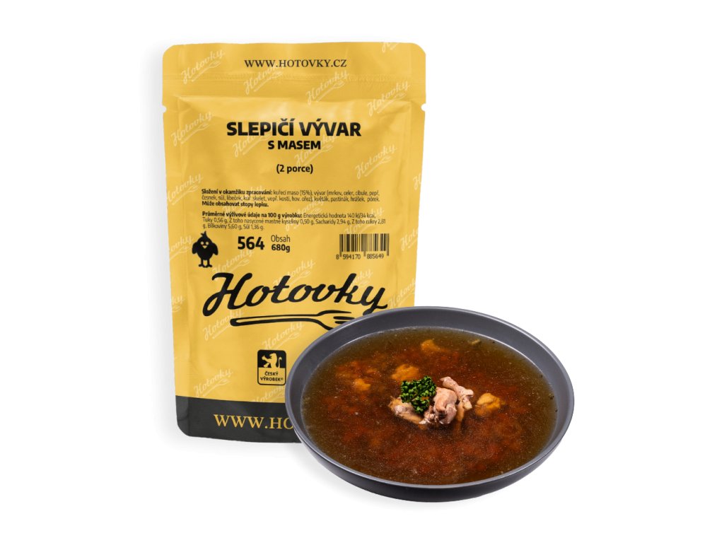 Čirý a lahodný slepičí vývar s masem potěší vaše chuťové pohárky. Obsahuje 15% kuřecího masa a kvalitní zeleninu, ideální pro dvě porce.