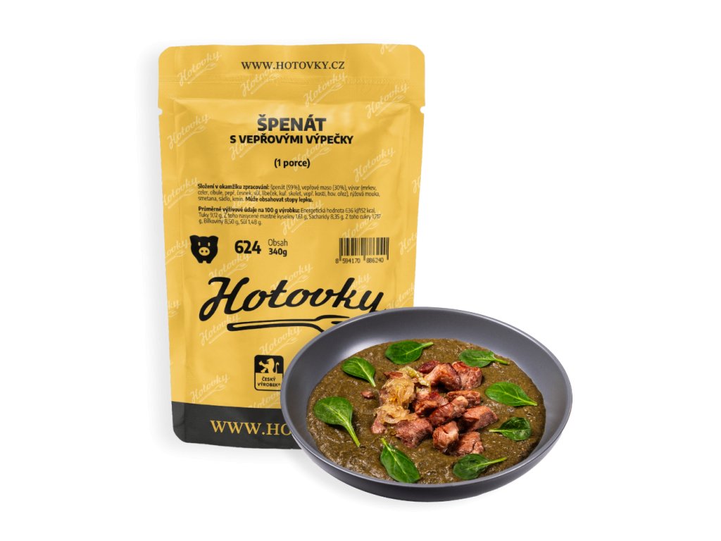 - Složení: špenát (59%), vepřové maso (30%), vývar (mrkev, celer, cibule, pepř, česnek, sůl, libeček, kuřecí skelet, vepřové kosti, hovězí ořez), rýžová mouka, smetana, sádlo, kmín.