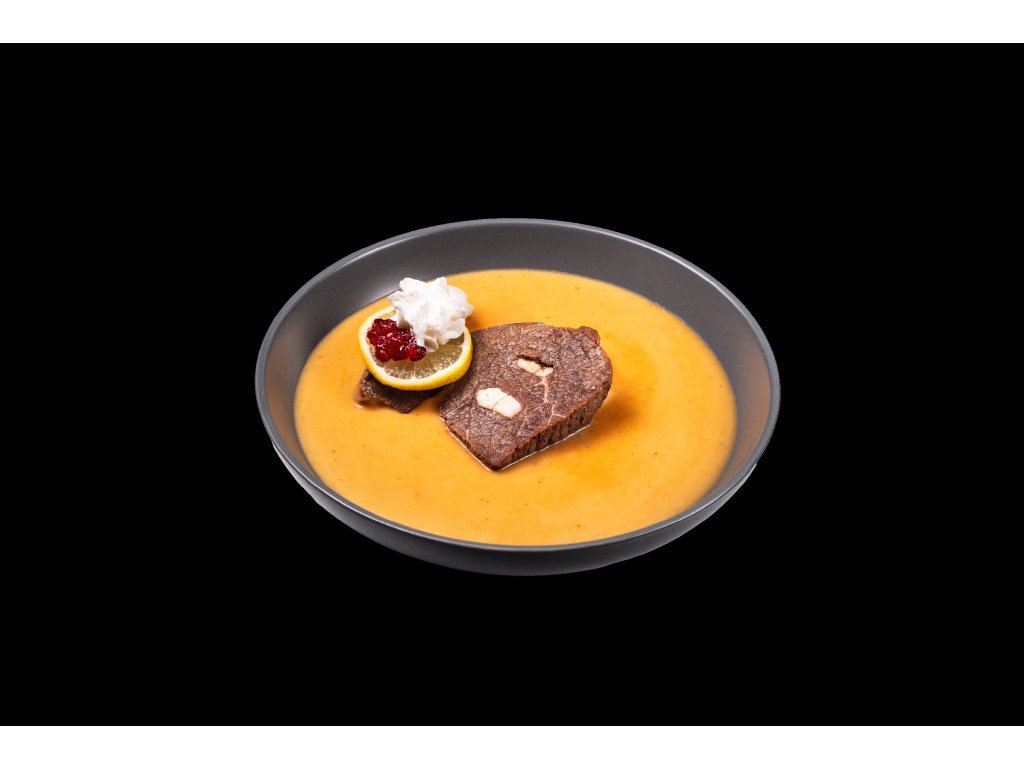- Složení: hovězí maso (30%), vývar (mrkev, celer, cibule, pepř, česnek, sůl, libeček, kuř. skelet, vepř. kosti, hov. ořez), rýžová mouka, smetana (4,4%), sádlo, cukr, uzená slanina, hořčice (hořčičné semeno, ocet kvasný, kurkuma, výtažek koření, voda), m. kukuřičný škrob, citron, víno, máslo, bobkový list, tymián, nové koření. Může obsahovat stopy lepku.