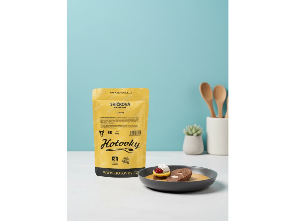 Toto hotové jídlo představuje tradiční svíčkovou, která nadchne všechny, kdo ocení autentické pokrmy české kuchyně. Je vyrobena z kvalitních surovin, mezi nimiž vyniká hovězí maso a vývar z kořenové zeleniny, doplněné o smetanu, uzenou slaninu a hořčici. Každé sousto přináší nezapomenutelný gastronomický zážitek, který se skvěle hodí na nedělní oběd nebo jako rychlé a chutné jídlo.