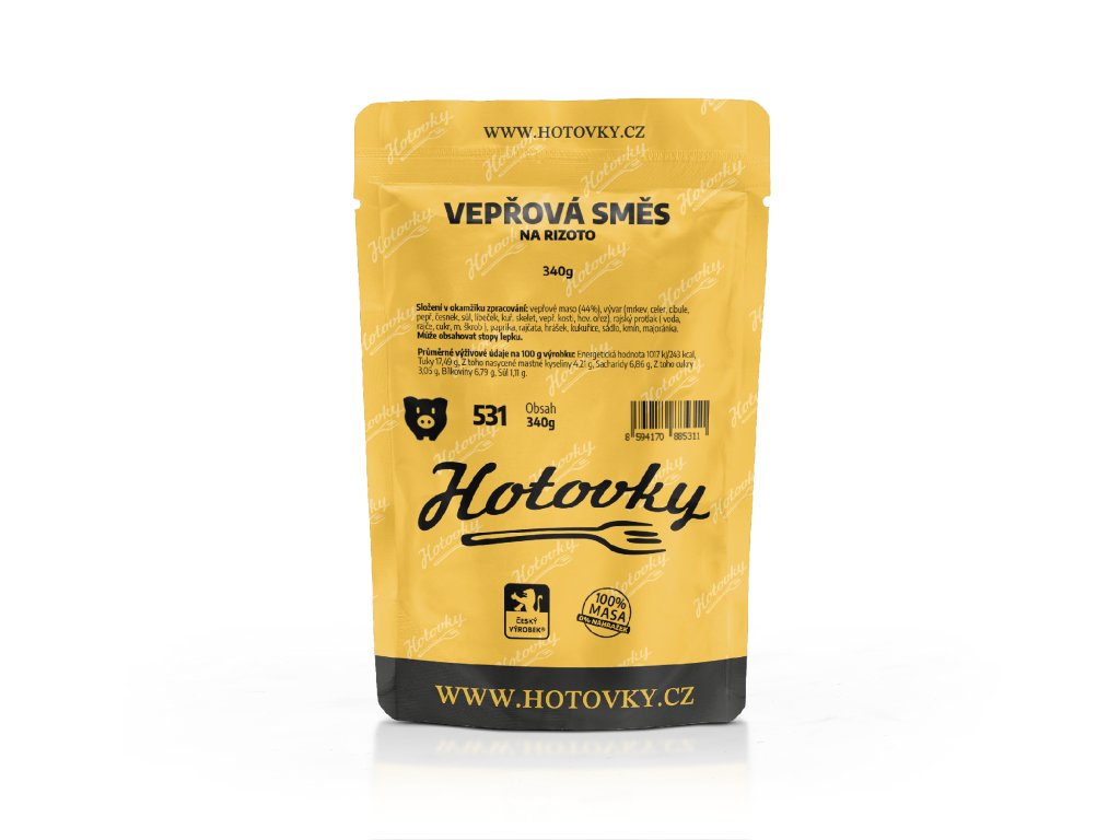 - Složení: vepřové maso (44%), vývar (mrkev, celer, cibule, pepř, česnek, sůl, libeček, kuř. skelet, vepř. kosti, hov. ořez), rajský protlak (voda, rajče, cukr, m. škrob), paprika, rajčata, hrášek, kukuřice, sádlo, kmín, majoránka.
