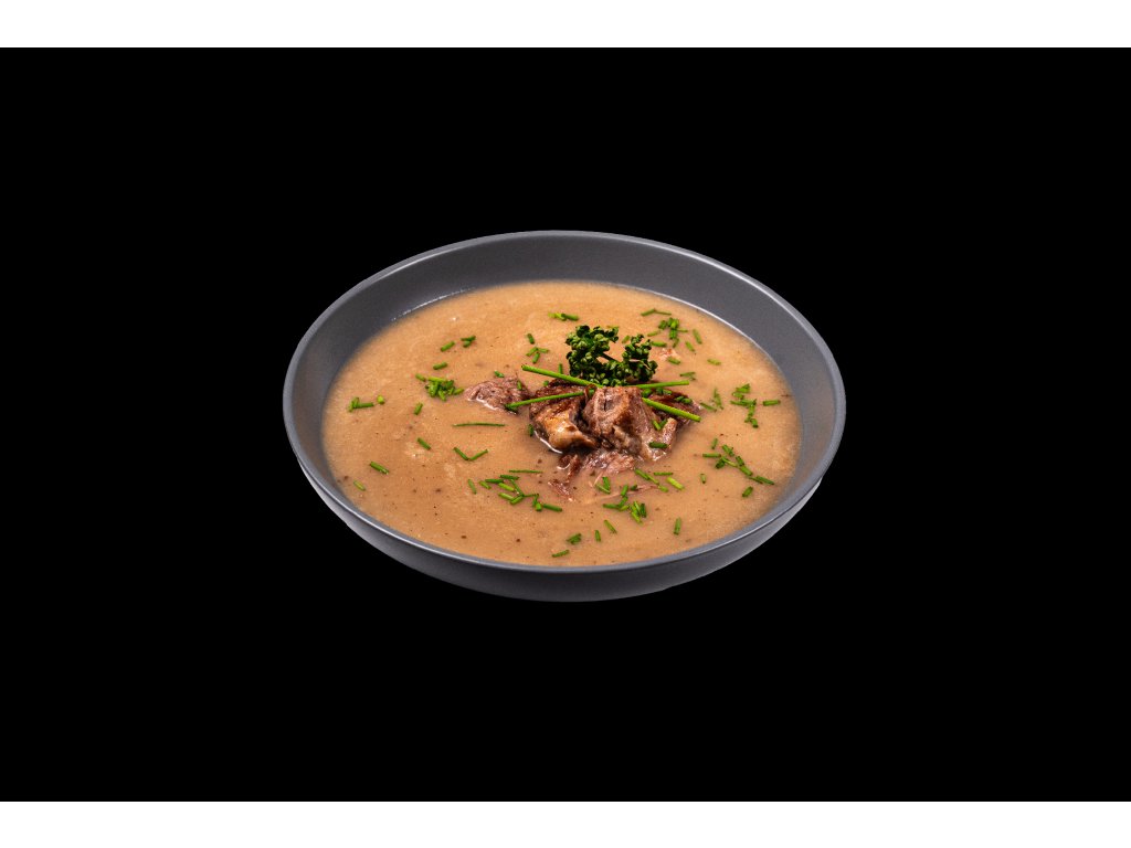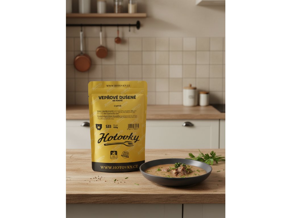 - Složení: vepřové maso (30%), vývar (mrkev, celer, cibule, pepř, česnek, sůl, libeček, kuř. skelet, vepř. kosti, hov. ořez), rýžová mouka, sádlo, kmín (0,1%).