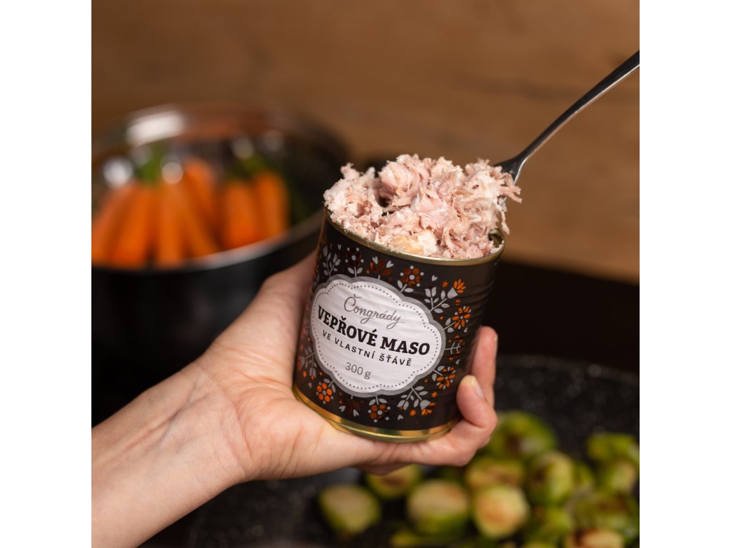 Praktická plechová konzerva s odtrhávacím víčkem usnadňuje skladování a použití, když dostanete chuť na něco výjimečného. Vepřové maso můžete podávat tepelně upravené s oblíbenou přílohou, jako jsou rýže, těstoviny nebo brambory, nebo si ho vychutnat studené s čerstvým pečivem jako lahodnou svačinu.