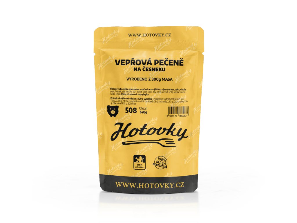 - **Hlavní složkou** je kvalitní vepřové maso, bohaté na bílkoviny - **Osvěžující chuť** dodává česnek (2%) a kmín - **Výborná kombinace** surovin, která vytváří harmonickou chuť - **Může obsahovat stopy lepku**, což je důležité pro alergiky Vepřové na česneku je ideální volbou pro všechny, kteří hledají chutné a kvalitně připravené jídlo. Pokud to není přesně to, co hledáte, prozkoumejte naši širokou nabídku dalších pokrmů na e-shopu!Doplňkové parametry