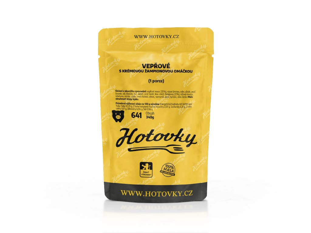 - Složení: vepřové maso (30%), vývar (mrkev, celer, cibule, pepř, česnek, sůl, libeček, kuř. skelet, vepř. kosti, hov. ořez), žampiony (12%), rýžová mouka, smetana, máslo, sádlo, směs koření, citron, rozmarýn, pepř, tymián, víno, kmín.